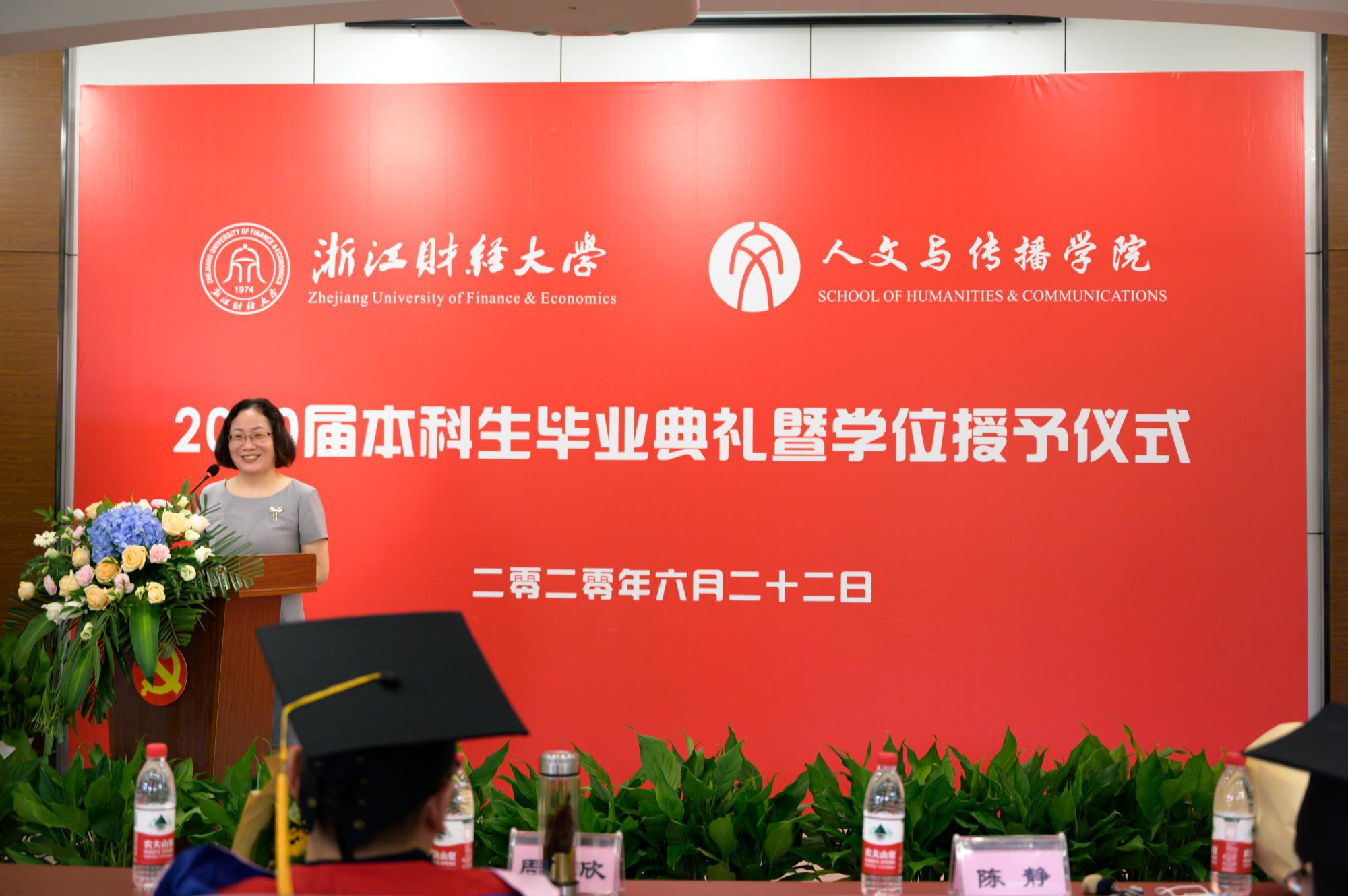 应届同学因为疫情面临更多的困难和不确定性,但从复旦大学、浙江大学、爱丁堡大学等世界名校升学,到腾讯、浙江中控等百强名企入职,我们依旧迎难而上成绩骄人。2020届毕业生汉语言文学专业陶娟、林滢、汉语国际教育专业舒昊、广告学专业邵珏书婷、赵雅雪、数字媒体艺术专业刘琦作为优秀毕业生代表上台向学院报告。“我将铭记住‘进德修业,与时谐行’的校训,也会记住我们‘为往圣继绝学,为万世开太平’的人文之光。”