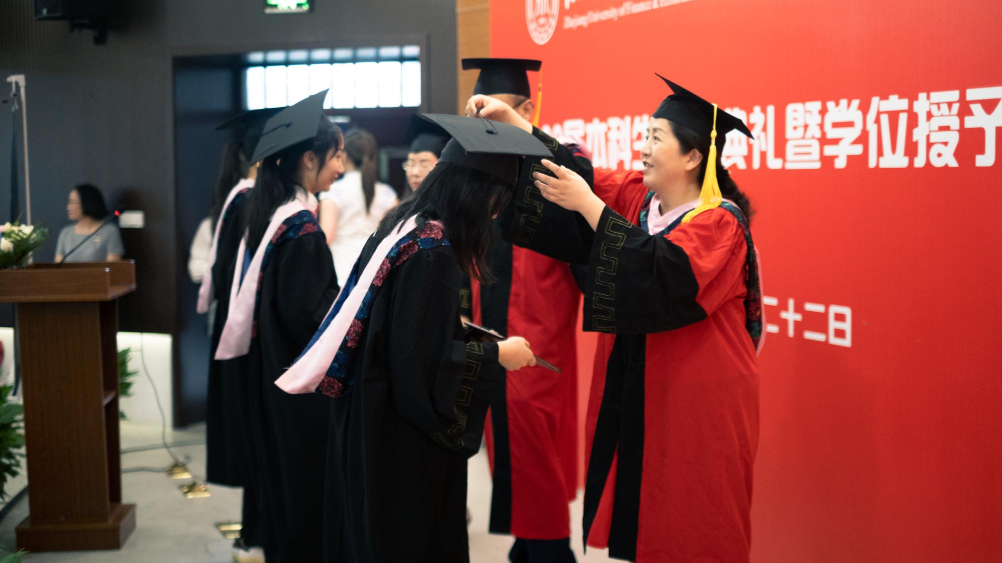 周保欣、高燕和陈静三位老师身着导师服上台,毕业生以三人为一组,走到老师前鞠躬致谢。老师与受礼的毕业生彼此握手,颁发学位证书。毕业生双手低头接过,老师将其学士帽右侧的流苏拨至帽左。从左到右,一个温柔轻缓的微动作,里面有着长辈欣慰莞尔,有着后辈的欢欣雀跃。