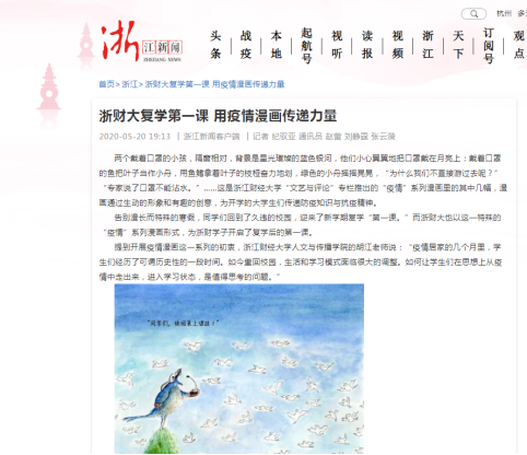 近日,浙江新闻网报道了太阳成suncitygroup太阳成集团教师胡江在专业教学中,带领学生开展“疫情”系列漫画创作活动,带动广大学生积极创作,发挥创意,表达大学生在疫情下的所思所想,通过生动的形象和有趣的创意,为返校复学的大学生们传递防疫知识与抗疫精神。目前,已有三十多幅优秀漫画被展出,部分作品已被《人民日报》漫画增刊选录。