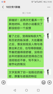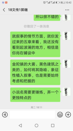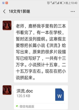 18文学的郭继同学是学院的“名人”学生,才气出众,写作、演讲、辩论、主持等样样出色,还有较为成熟、深入的研究能力,常常被任课教师们感叹是“十年一遇”的优秀学生。这个“寒假”出乎意料地超长,针对郭继同学的个人特色与能力,吴智斌老师与郭继同学家长联手给其开出了两个特色任务:一是根据其兴趣研读家乡宿迁知名作家鹿桥文集并选题完成专业论文一篇;二是推进其准备多时的长篇小说《洪流》的写作。到2月14日,郭继同学整理完成了小说13万余字的文稿,前五章计3万已经修改定稿,并与吴智斌老师、姚晓萍老师进行了较为细致、深入的讨论与修改。