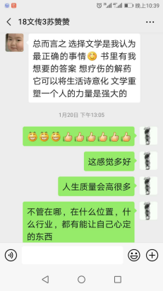 在假期中,支部的教师党员还收到了18数媒专业聂纪铖同学的剧本《裂》和一段令人鼓舞的留言:“老师,我想在大学期间拍一部长片,我写好了故事,希望老师给我一些指导。”而作为大二学生的他,已经在过去的一学期中完成了一部质量不低的微电影《火》,在同学们之间形成了一定的影响。也是这个假期,他们收到了18文学苏赞赞同学令人欣喜的表白:“总而言之,选择文学是我认为最正确的事情!”而在2019年上学期,苏赞赞同学曾经在因为选择专业上的万分纠结,曾经向支部才党员教师们寻求帮助。