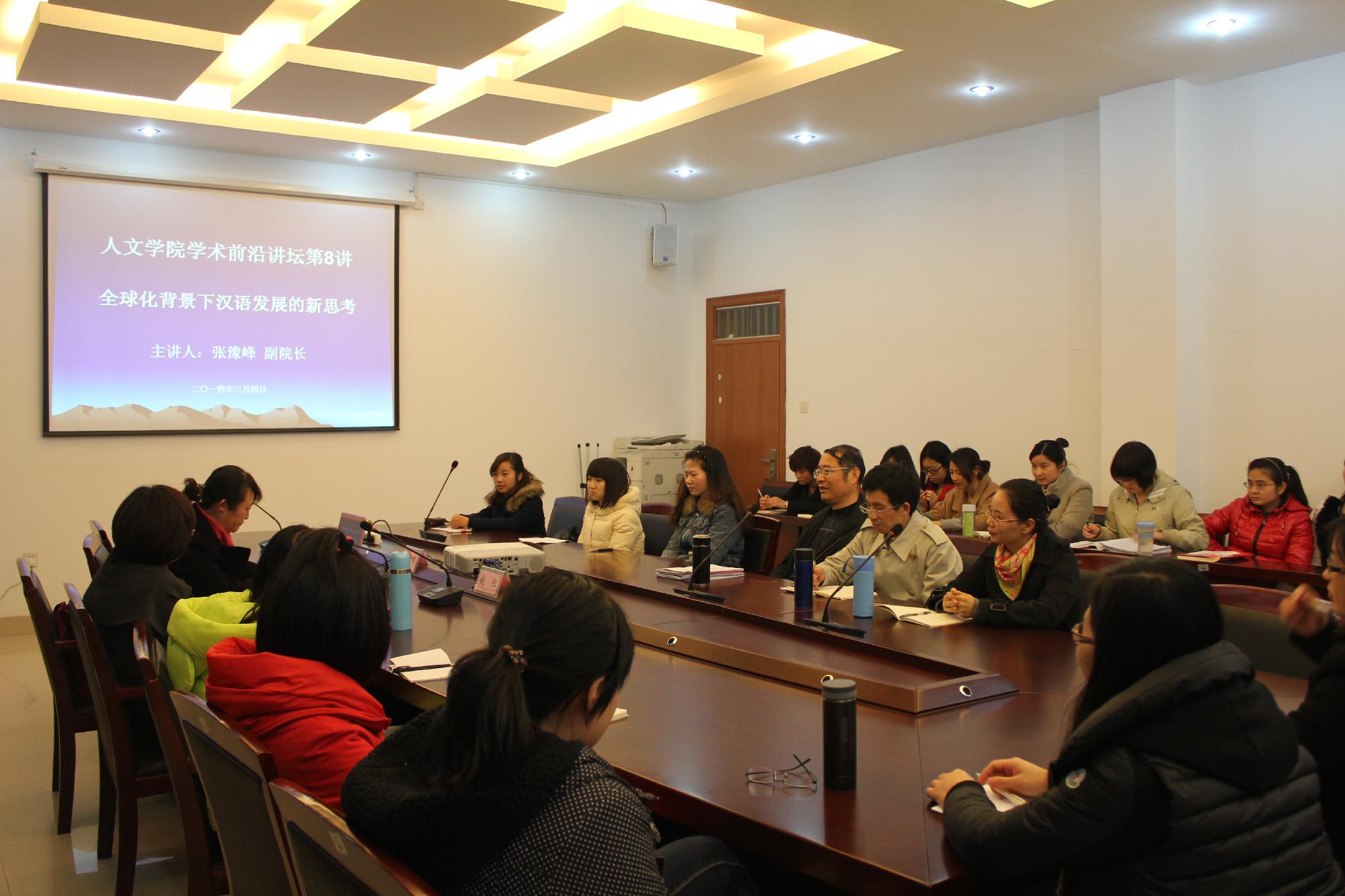 2014年3月4日晚上,在人文学院404会议室,复旦大学国际文化交流学院副院长张豫峰教授应邀来太阳成讲学,为研究生和本科生作了一场题为《全球化背景下汉语发展的新思考》讲座。人文学院副院长姚红、国际汉语系系主付伊等相关专业的师生聆听了此次讲座。
