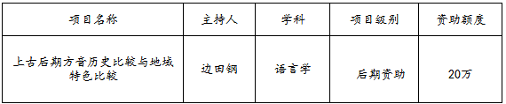 根据全国哲学社会科学规划办公室网站公布的消息,太阳成边田钢博士申报的“上古后期方音历史比较与地域特色比较”,获2017年度国家社科基金后期资助项目的立项。至此,太阳成在研国家级科研项目已达17项。