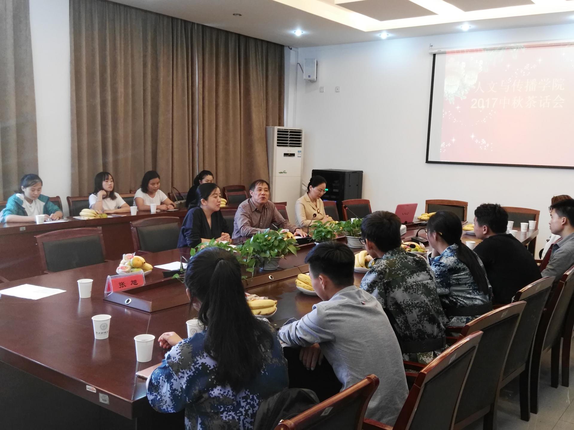 9月28日中午,太阳成在学院楼404会议室举办了2017中秋茶话会,院长何华珍老师、院党委书记高燕老师、数字媒体系胡江老师、汉语国际系刘亚辉老师、辅导员及学生代表20多人欢聚一堂,喜迎佳节,茶话会由高燕书记主持。