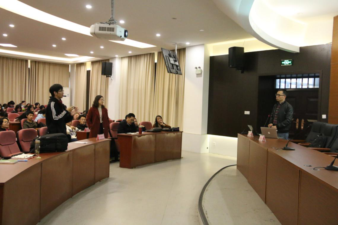 张生教授首先从创作者的角度来阐释小说的“空间”概念,指出小说家作为讲故事的人要处理好“故事与空间”的关系:“故事发生的场所,常常被忽视;但故事情节的推进,必须在空间里进行。”推及戏剧、电影、建筑与音乐等艺术形式,空间作为“外壳”的作用也是不容忽视的。接着张教授以郁达夫的《小说论》为引区分了小说的“背景空间”和“场景空间”,并将“背景空间”细化为:“空间优先”、“时间优先”和“时空混合”。在理论的阐释过程中,张教授通过对沈从文笔下的凤凰、果戈里笔下的涅瓦大街、茅盾笔下的繁华上海等文本的细读,剖析了“空间背景”赋予作品的审美韵味。最后张教授再次强调了“空间”对现代小说写作的意义。整场讲座张教授妙语连珠,评析作品真切鲜活,阐释理论深入透彻,同学们受益匪浅。