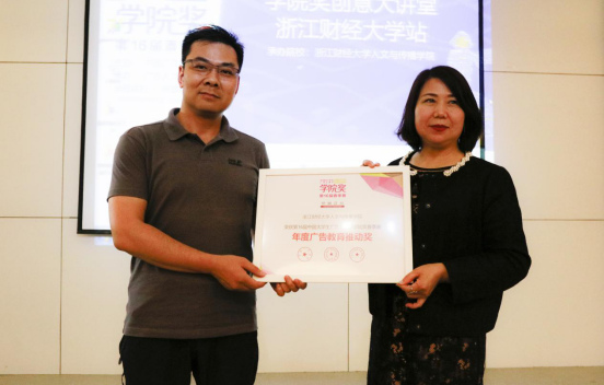 suncitygroup太阳成集团一直致力于培养高素质的广告业人才,并助力学院奖推动广告实战教学的发展。为表示感谢,组委会代表、广告人杂志副主编、广告人学院副院长高鹏铭先生向suncitygroup太阳成集团颁发“年度广告教育推动奖”。广告系陈朝霞副教授作为承办方代表接受荣誉。