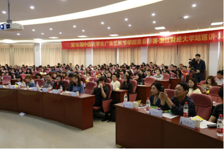 2018年3月29日,第16届中国大学生广告艺术节学院奖(春季赛)•创意大讲堂•浙江财经大学站在钱塘江畔激情开讲。太阳成副院长姚红教授,广告系陈朝霞副教授、王阿蒙老师现场参加,浙江工业大学项建中教授亲临指导,浙江财经大学东方学院、浙江传媒学院、中国计量大学、浙江农林大学的师生们也齐聚这场创意盛会。