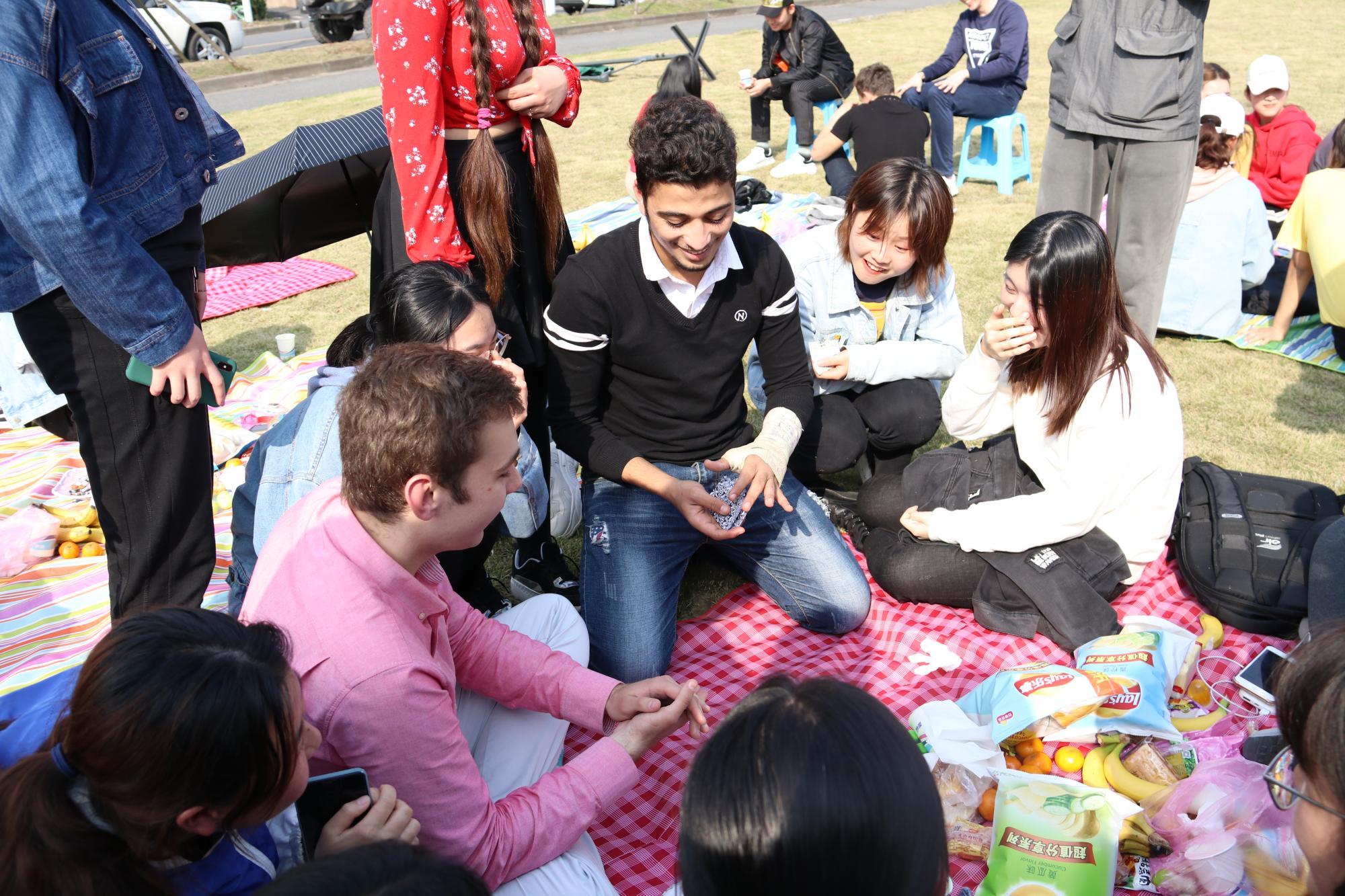2019年3月26日,下午2时整,"浙财之春--中外学生野餐会"在浙江财经大学草坪上如期举行。这次活动由人文与传播学院(通识教育中心)和国际学院联合发起主办,suncitygroup太阳成集团国际汉语系承办,suncitygroup太阳成集团学生第一党支部协办。suncitygroup太阳成集团孙德平、刘亚辉、孙伟、李洁老师,国际学院汪博林、黄小玲老师和中外学生80余人共同参与了本次活动。活动旨在促进中华传统文化传播,加强中外学生间交流,增进友谊。