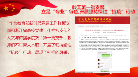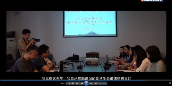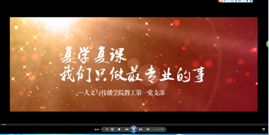 随后,观看《专业特长助力抗“疫”行动,党建引领凝聚支部合力》微党课视频。在“七一”到来之际,教工第一党支部毋丹老师录制了微党课视频,讲述了作为教育部新时代党建工作样板支部和浙江省高校党建工作样板支部的太阳成教工第一支部全体党员教师,在疫情期间,不忘教育初心,发挥文学专业特长,开展了“以文字为工具”、“以学生为根本”的强持续性“抗疫”行动,师生互动、家校联动,守护学生成长,真正实现了停课不停学,隔离不隔爱,取得了良好的教育效果,得到了学生家长们的一致肯定。