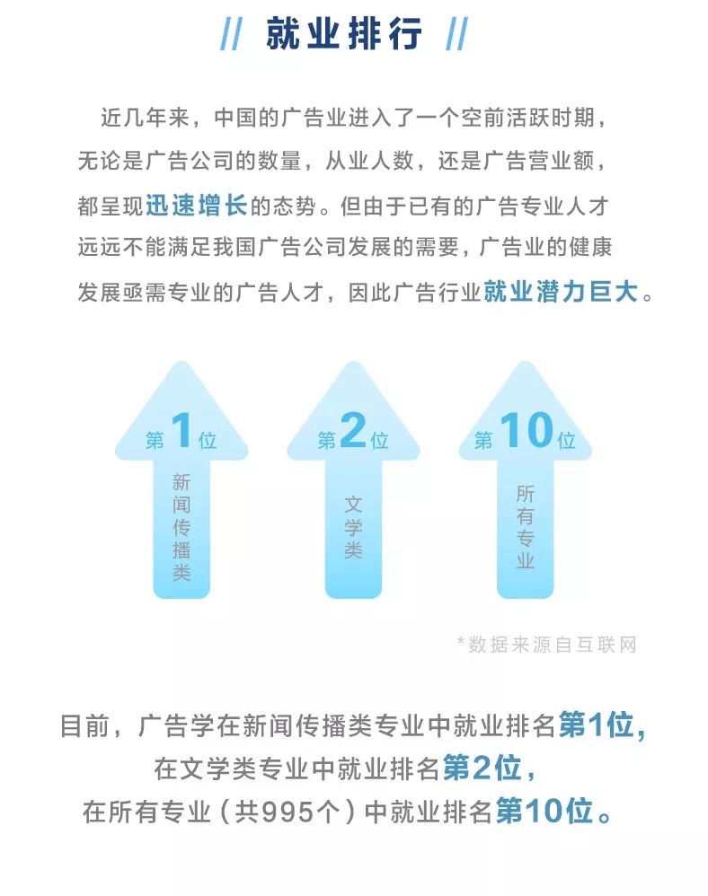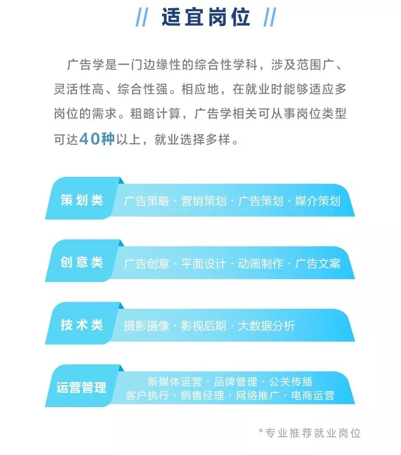 广告学是一门结合性的边缘科学,涉及社会学、经济学、心理学、新闻学、传播学、语言学、统计学、美学、声学、光学、电学等众多学科,广告学所培养的学生具备综合性素质,能够适应市场不同的人才需求。