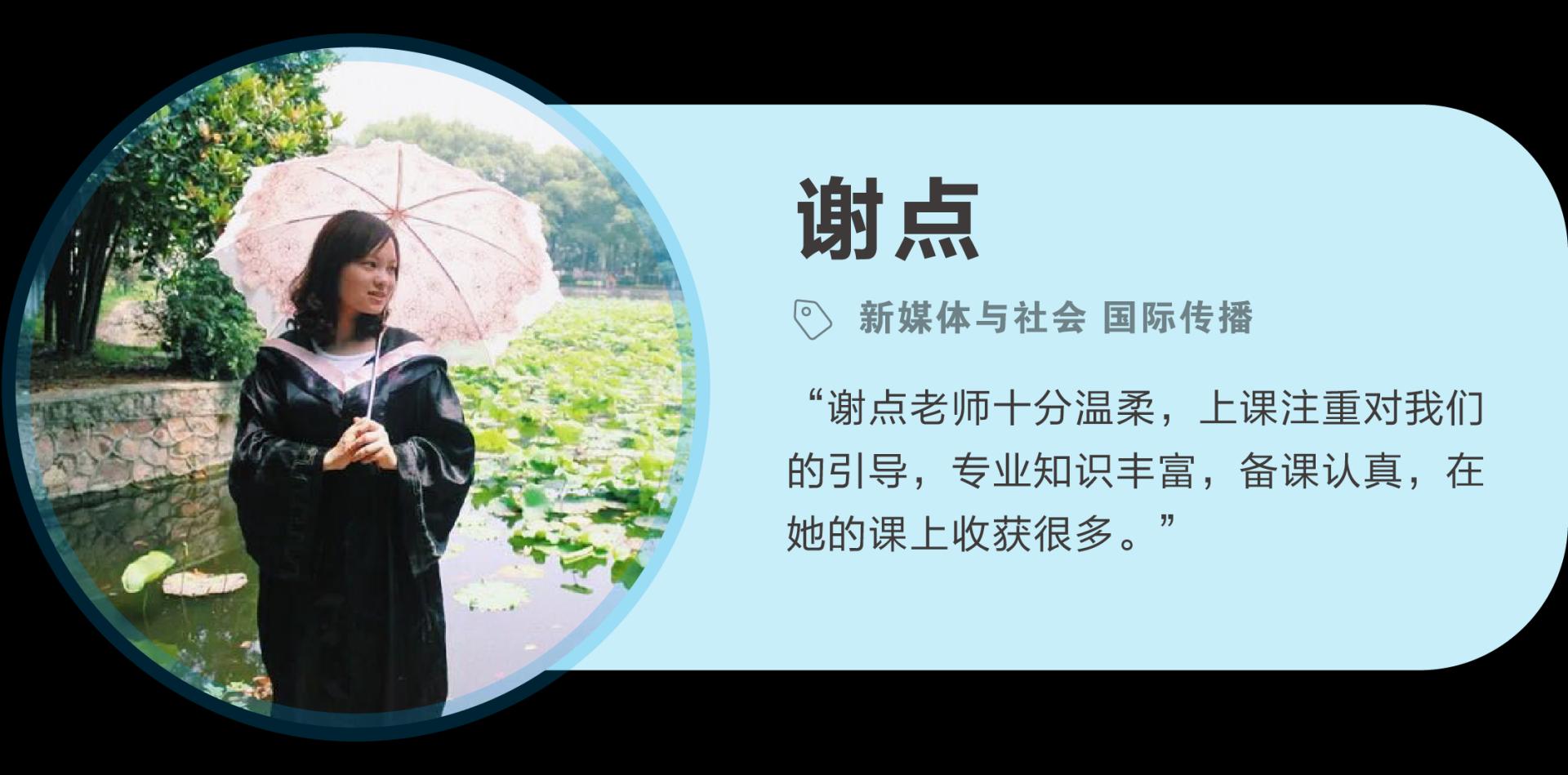 谢点,女,1991生,现任浙江财经大学广告系讲师。2012年本科毕业于华中科技大学新闻与信息传播学院,获文学学士学位;2017年博士毕业于浙江大学传媒与国际文化学院,获新闻传播学博士学位。研究方向和研究兴趣为新媒体与社会、国际传播等。