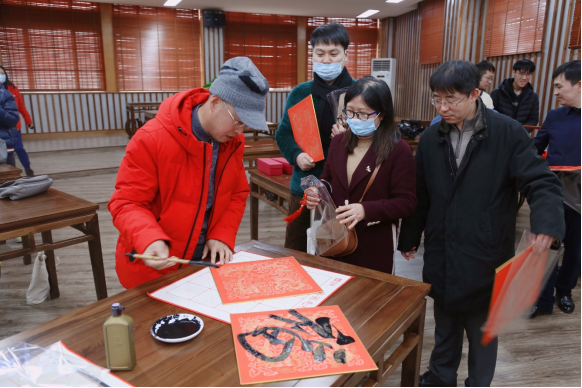 12月28日下午,在学院问津书院,学院教师周寒筠和赵文源老师为教职工现场写“福”字和春联。现场墨香四溢、喜气洋洋,红红的福字和灿烂的笑脸将活动现场烘托得格外的火热和喜庆,老师们高兴地展示他们刚刚拿到的“福”字和春联,喜悦之情溢于言表。