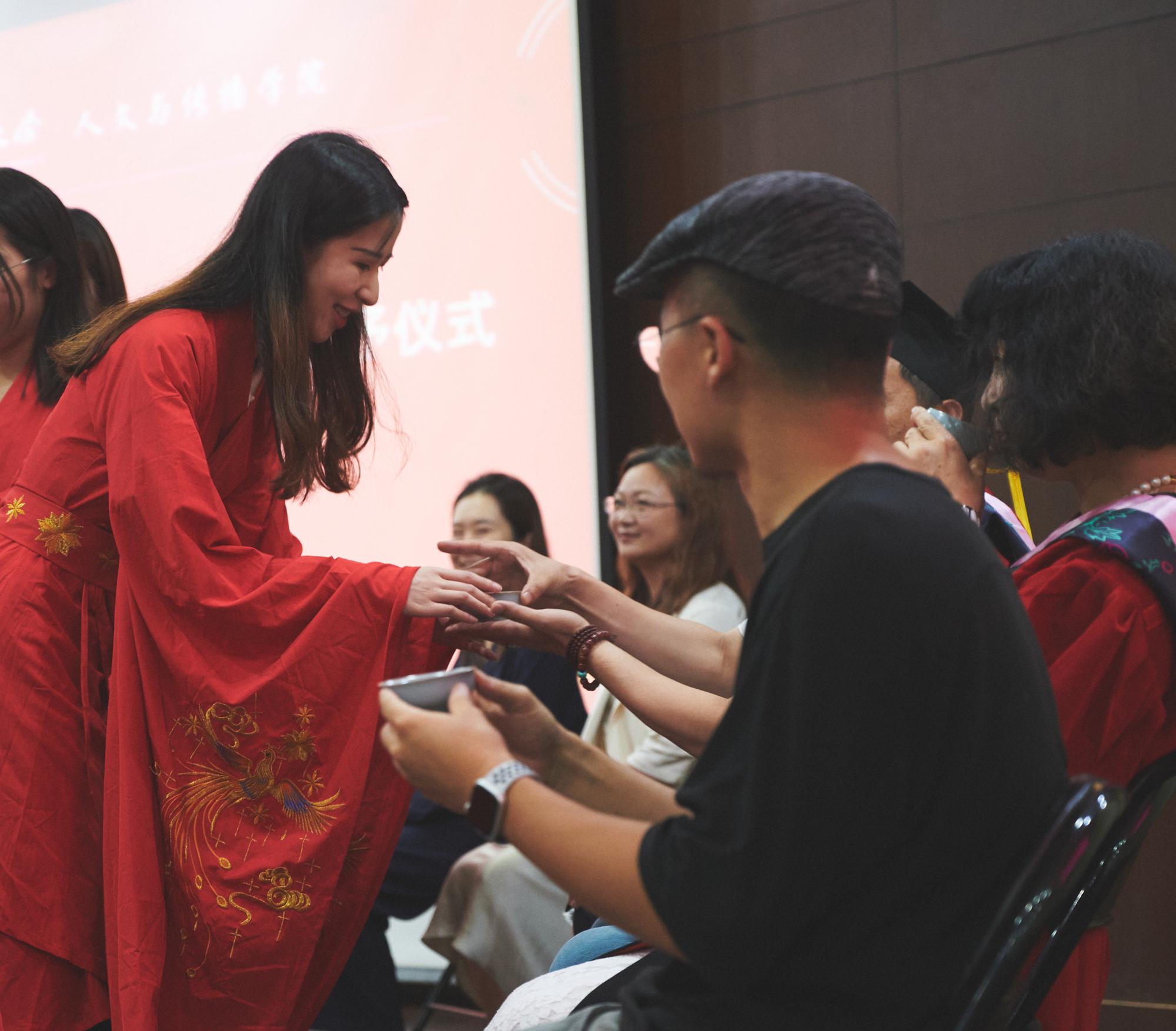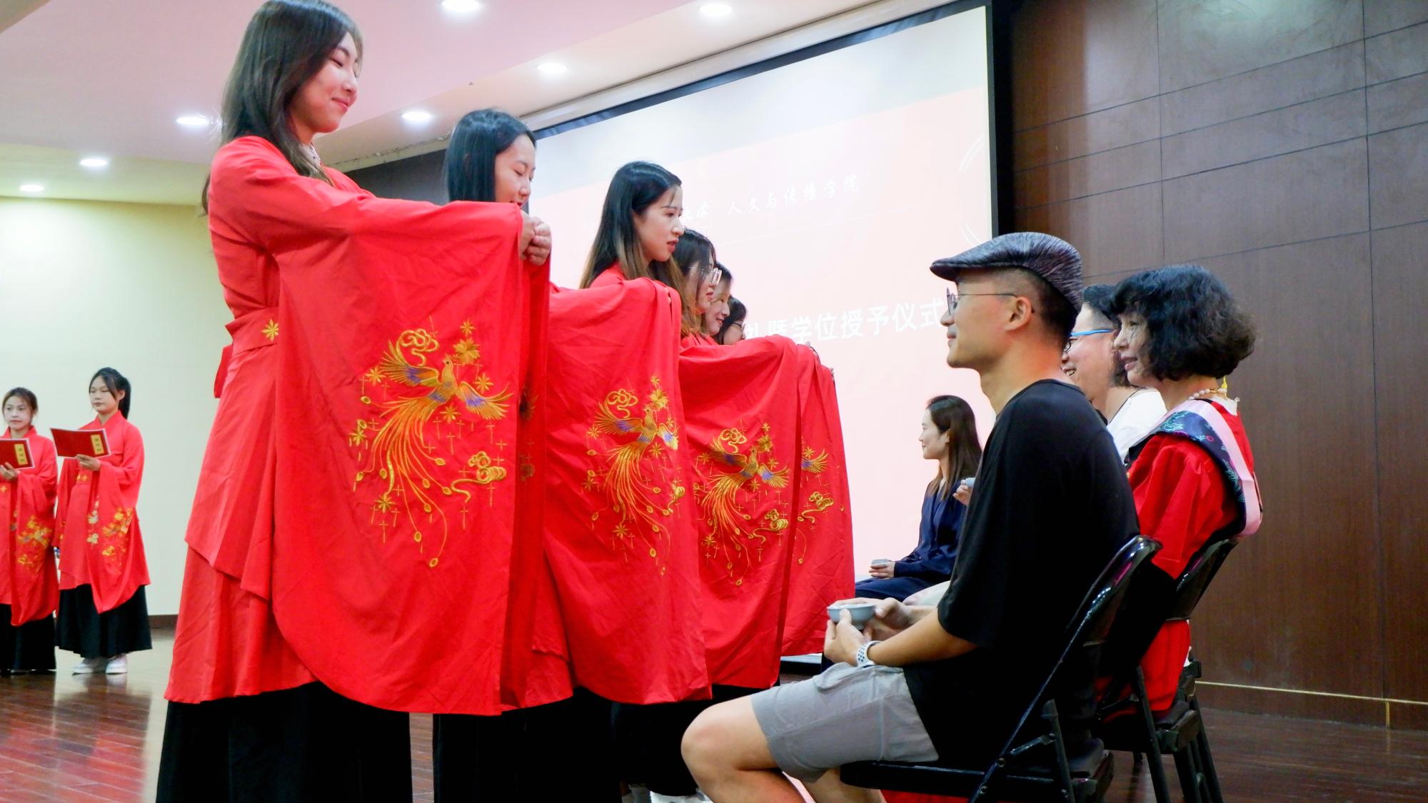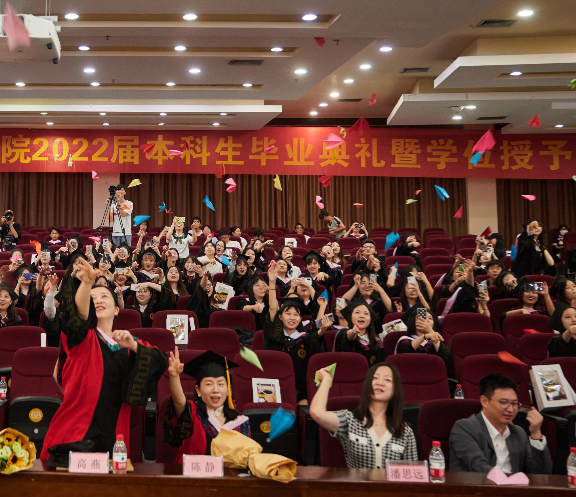 周保欣、高燕、陈静、吴智斌、赵顺宏、陈朝霞和洪艳七位导师身着导师服上台,毕业生以7人为一组,上台与导师们热情地握手拥抱,微微低头,让老师将其学士帽右侧的流苏拨至帽左。同学们接过导师们颁发的学位证书和毕业证书,扶苏拨穗、美好定格,学院用这种庄重的仪式感,为毕业学子们的大学生涯,画上一个圆满的句号。2022届毕业生的人生新征程,由此开启。愿有前程可奔赴,亦有青春可回首。