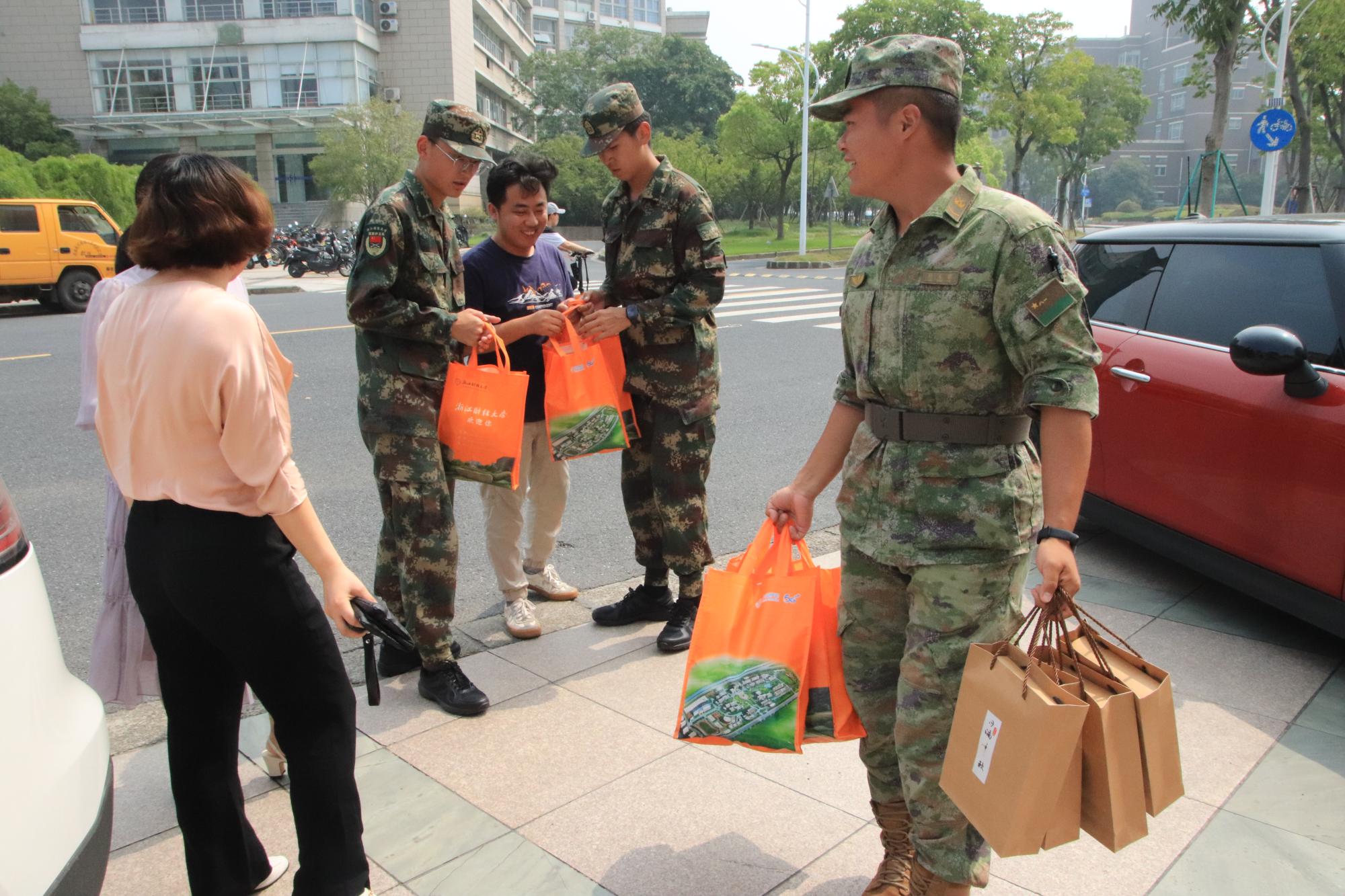 在新生教官的协助下,老师们分发了学院精心准备的节日慰问礼品——印有浙江财经大学logo的多种口味月饼。同学们为来自学院的关怀所感动,并向前来慰问的老师们表达了诚挚的感谢。