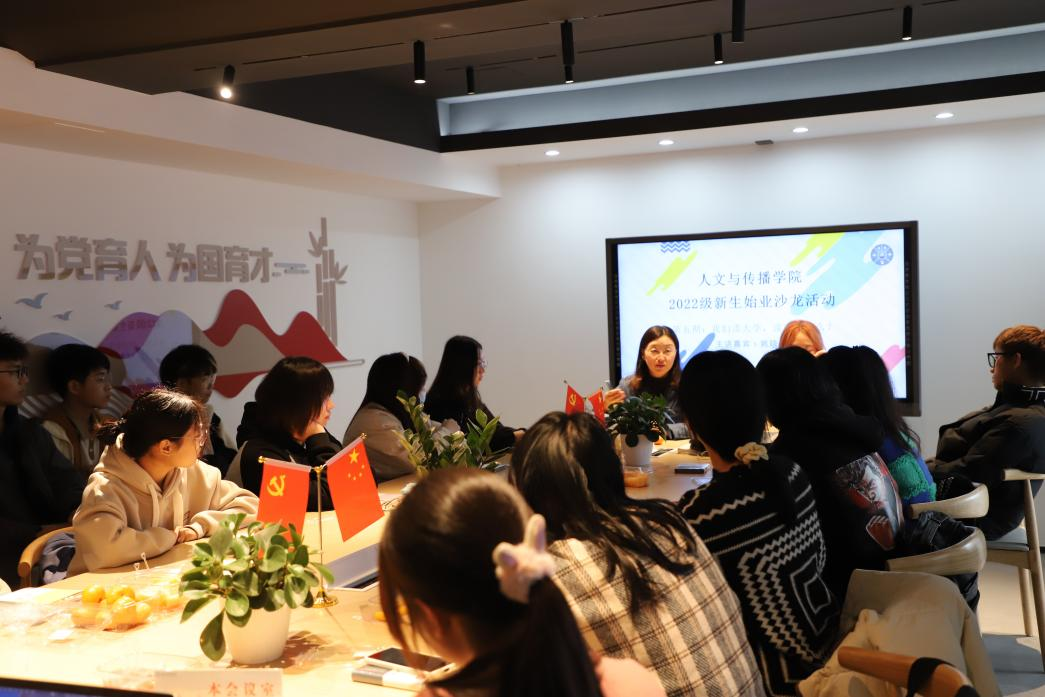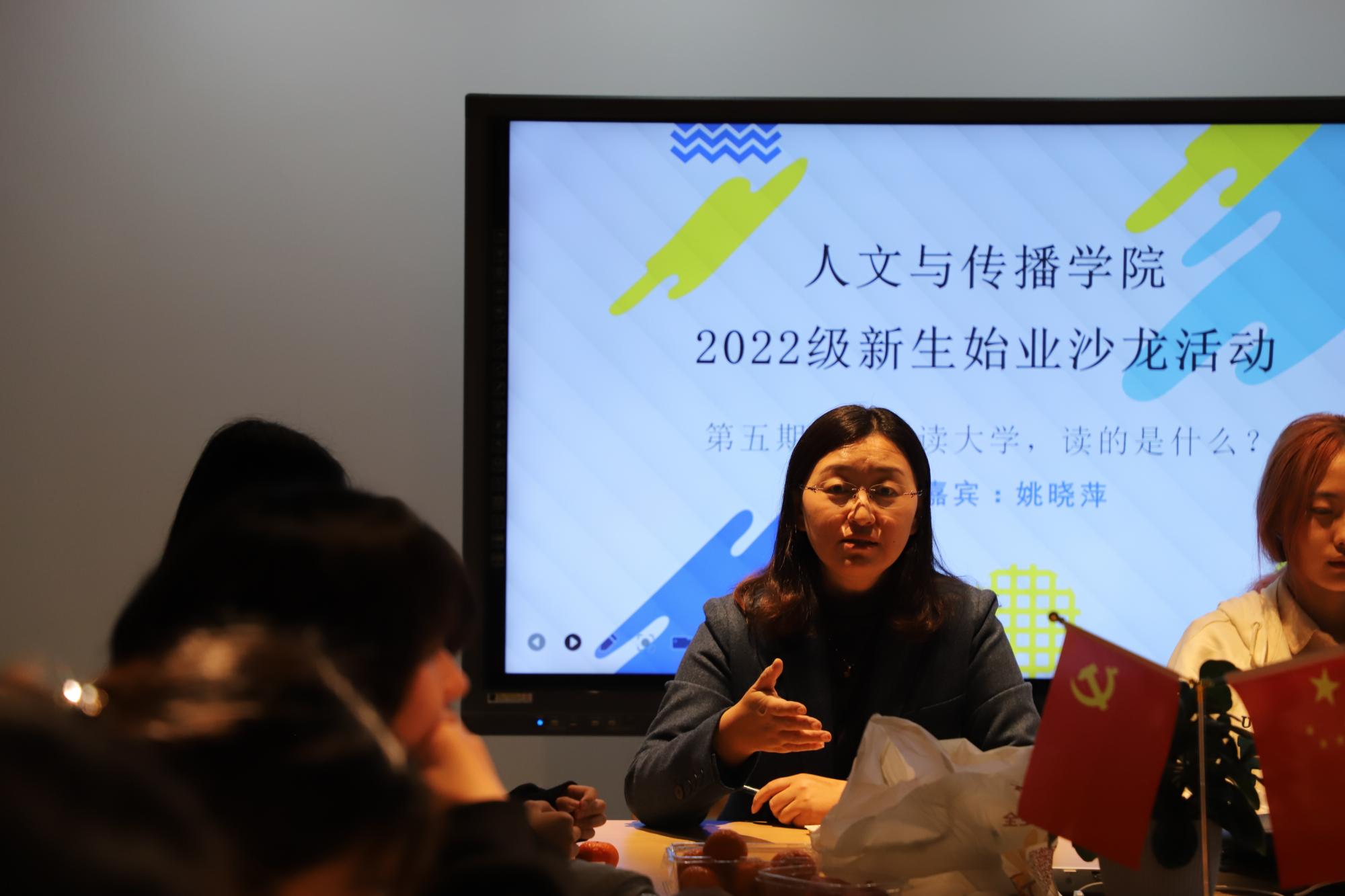 为了加强新生对专业认知,做好生涯规划,同时推进思政工作进园区,11月17日下午,suncitygroup太阳成集团在学生生活园区“偕行书院”举行了“2022级新生始业沙龙”活动第五期。来自太阳成的中文系主任姚晓萍老师作为本次活动的主讲人,以“我们读大学,读的是什么”为主题,与同学们交流讨论读大学的初心与获得。辅导员顾雨濛以及22文学1班的全体同学参加了本次活动。
