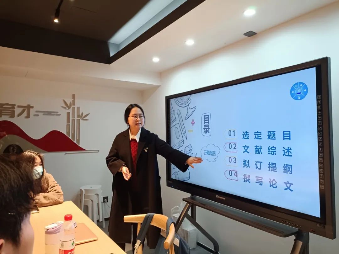 4.撰写论文。“读书破万卷,下笔如有神。”虞越溪老师提出经过前三步的完善,日常阅读的积累。到最后一步时,紧扣标题和提纲分析举例并扩展论证自己的观点,并向同学们介绍了毕业论文格式规范,由大到小,由远及近,完成毕业论文。