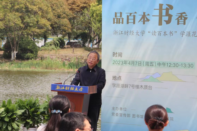 钟晓敏校长在致辞中表示,一直以来,学校把打造书香校园作为校园文化建设的重要内容。学校读“百本书”活动历史悠久,作为在校学生的必修课,不仅丰富了学生课外生活,扩展了学生的知识面,为校园文化建设注入了活力,而且形成了富有特色、可持续发展的国家级校园文化品牌,体现了大学生回归读书初心的制度保障,使阅读好书成为每一位浙财学子的习惯。他从“为何要读书”“读什么书”“如何读书”三个方面阐释了开展“读百本书活动”的重要意义和作用。“书需要人去读,才能熠熠闪光;人需要多读书,才能顶天立地。”他强调,一个人的成长史一定有他的阅读密码,美好的青春时光需要书籍的陪伴和滋养。希望同学们怀着好奇心去读书,读古今中外经典名著,以书为友,常读常新,从而做一个健全发展的自由的人,希望浙财大的学生都能被熏陶成为一名真正的“读书人”。