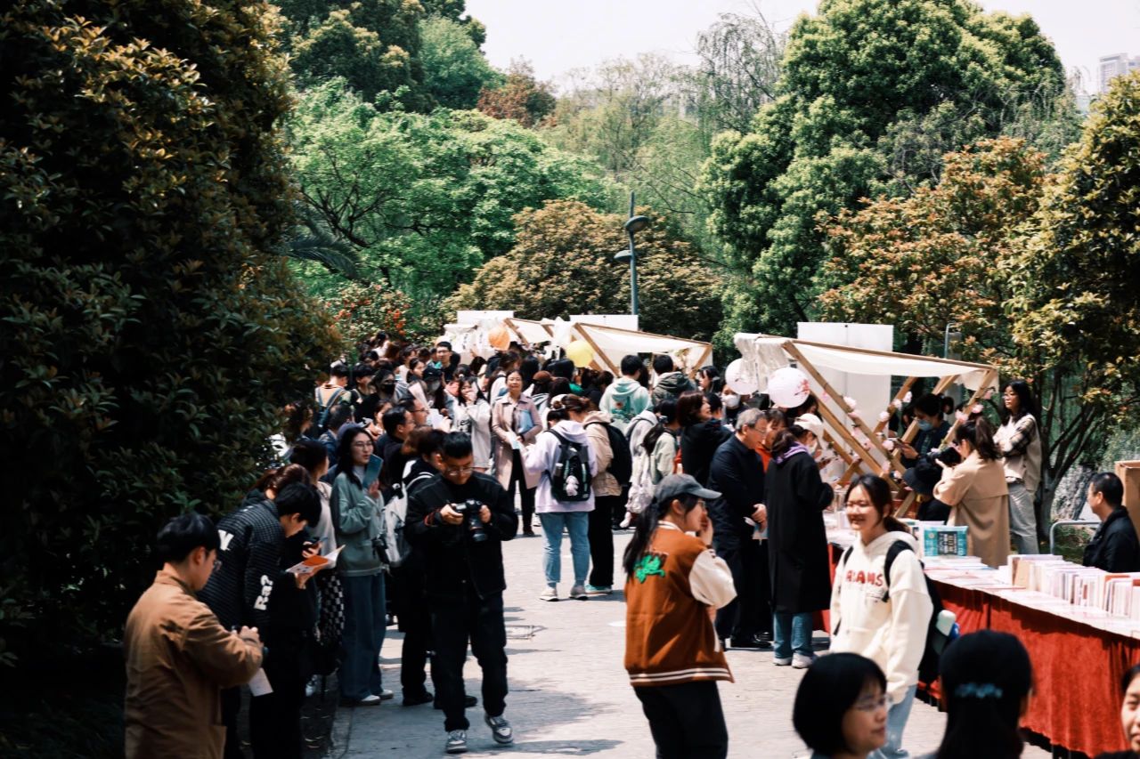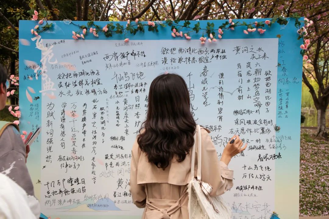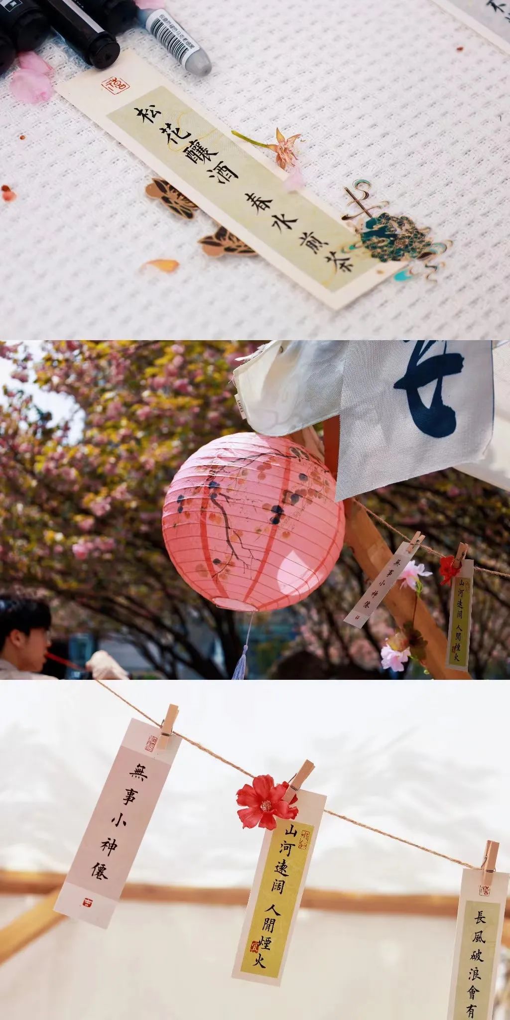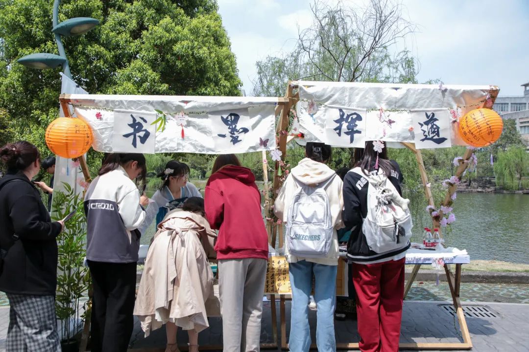学涯湖畔,微风习习,桃花间杂柳絮缓缓落下,第二篇章“花朝游园,驿传雅韵”活动与读书活动同时进行,主要包括“飞花传典、文识百本、书墨挥遒、花盏语谜、压花留春、学涯书市”系列活动。