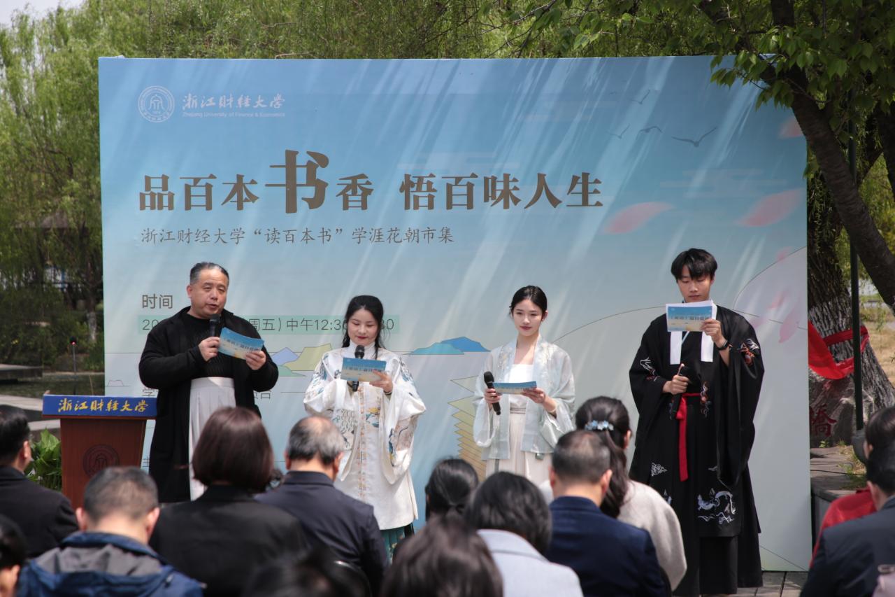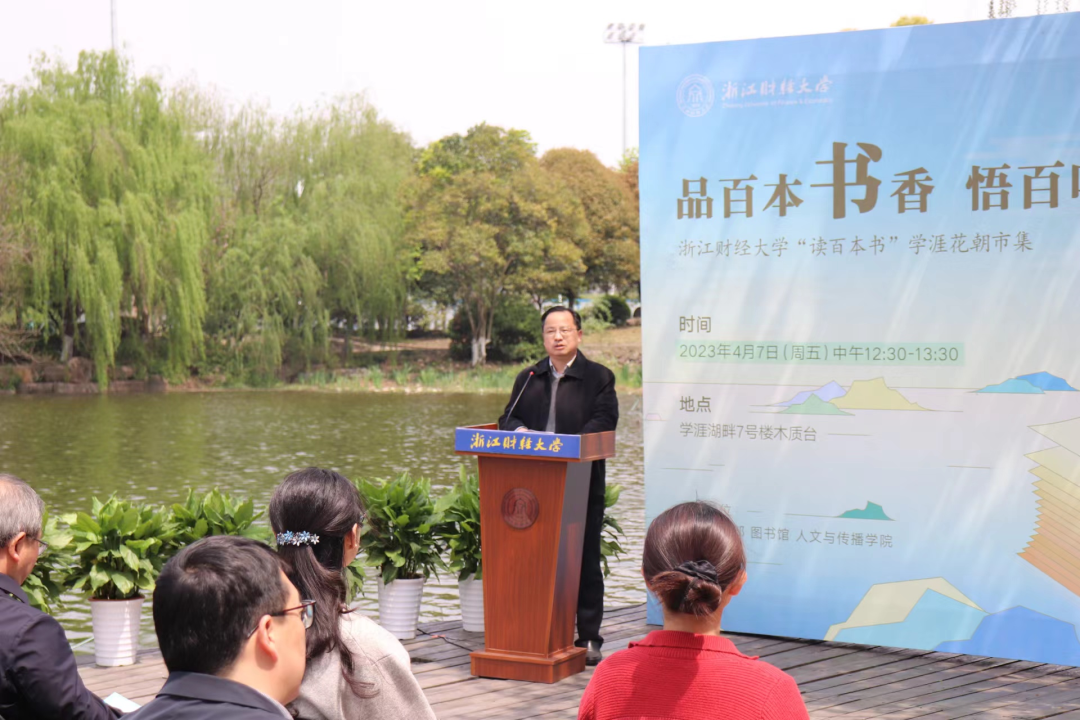 4月7日中午,伴随着春日的暖阳,沐浴着和煦的春风,浙江财经大学“读百本书”学涯花朝市集活动在学涯湖畔顺利举办。校党委副书记、校长钟晓敏及相关职能部门负责人、各学院分管学生工作副书记和师生代表参加活动。活动由校党委委员,组织部、宣传部、统战部部长楼胆群主持。