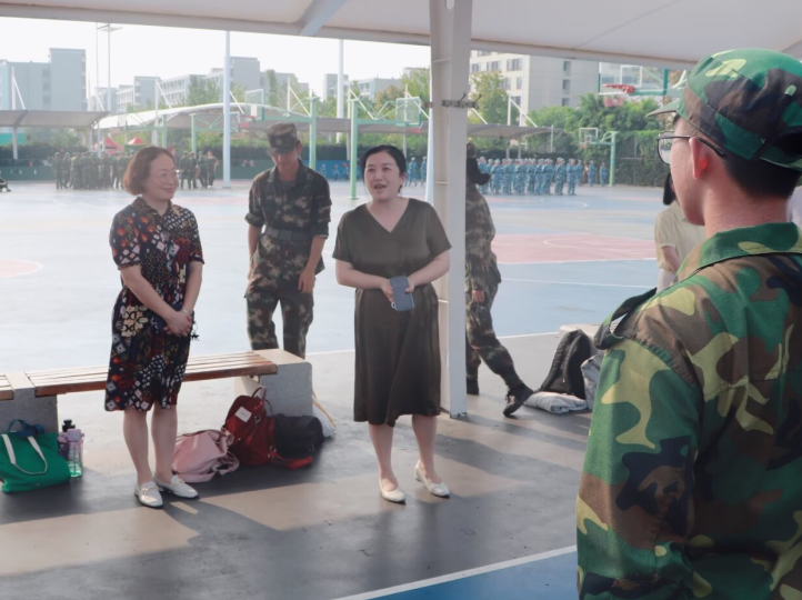 现场,高燕老师对同学们的训练状态表示肯定,并叮嘱同学们要服从教官指挥和军训安排,严格训练,坚持到底;培养吃苦耐劳、奋勇争先的精神,不断增强纪律观念和团队协作意识,将军训中学习到的优良品质融入到今后的学习和生活中。随后,老师们向教官们了解军训基本情况和日常生活需求,对他们的辛勤付出表示感谢。