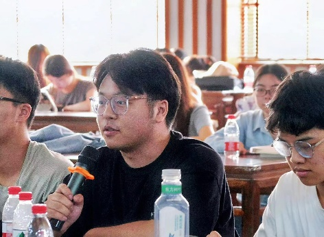 众所周知,余华以及其代表作之一的《活着》一直以来都保有较高的讨论度,对此,黄老师也想听听年轻一代的声音,于是她抛出了问题:用几个词形容读到《活着》的第一感受?思考片刻后同学们踊跃发言,或感惨烈,或谈悲怆,或觉平静,或议荒诞,更有同学言简意赅地指出:他眼中的福贵好像就是为了活着而活着。听此发言仿佛能感受到福贵纯粹又别有意味的人生。一个个精彩的回答既展示了同学们对《活着》的独到见解,更是将本次读书会的氛围推向了高潮。