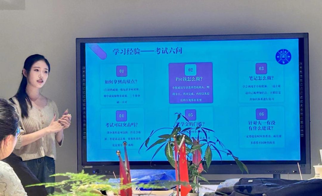 之后任玉函老师将时间交给吴若曦学姐。吴若曦学姐作为21级的学生和校艺术团副团长,成绩优异,经验丰富。她首先对六个问题进行解答——如何拿到高绩点;Pre和笔记怎么做;考试是否可以突击;奖学金门槛以及给大一新生的建议。同时,吴若曦学姐推荐了一些适合汉语言专业的阅读书目,供同学们参考。其次,她针对选课提出了自己的理解和想法,包括研究培养方案,尝试各个领域的课程以及咨询学长学姐的意见等。