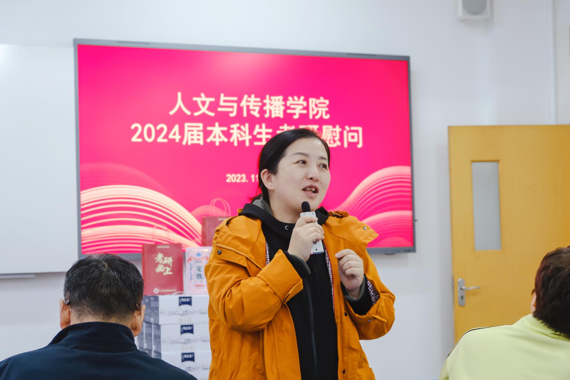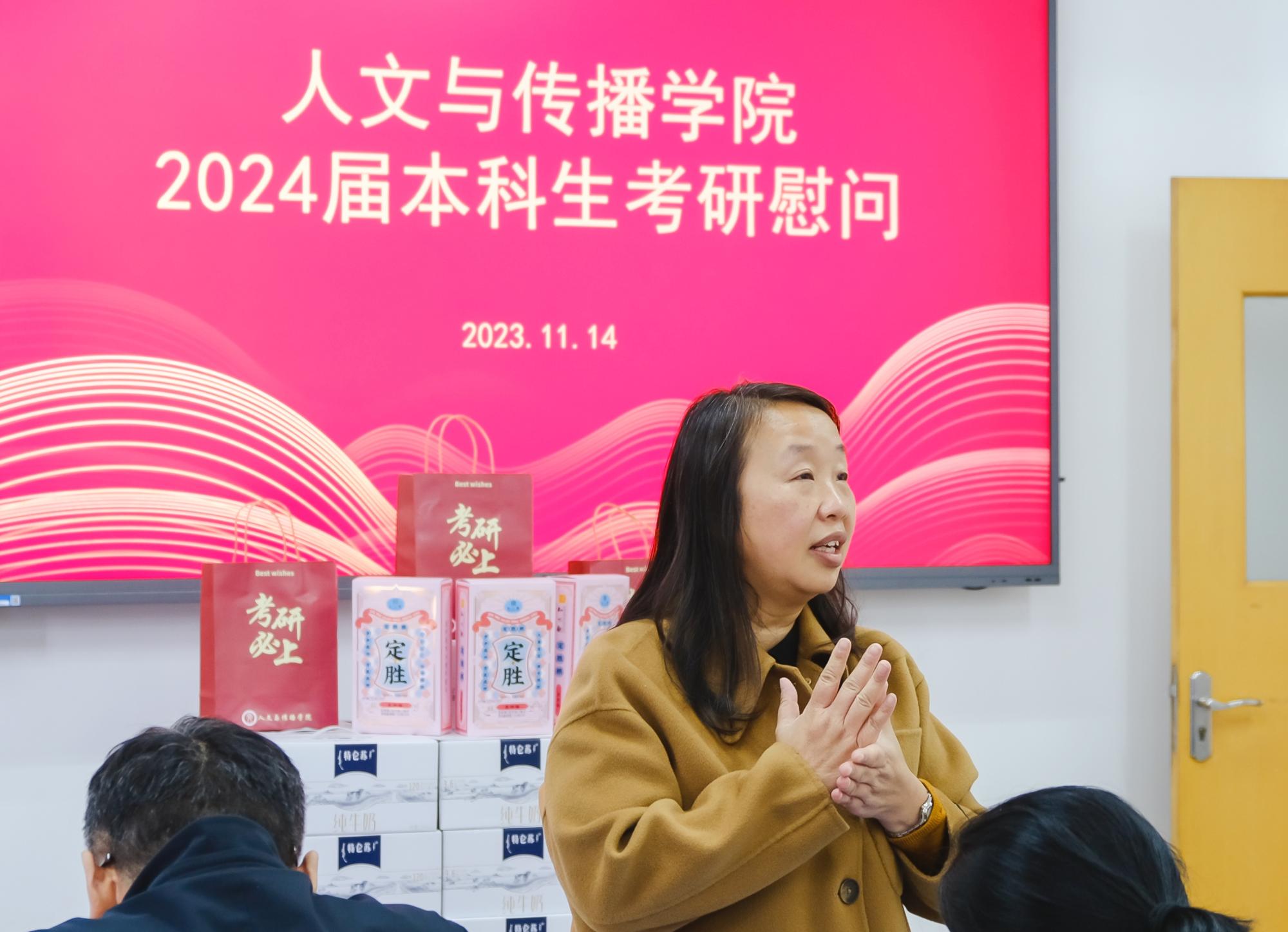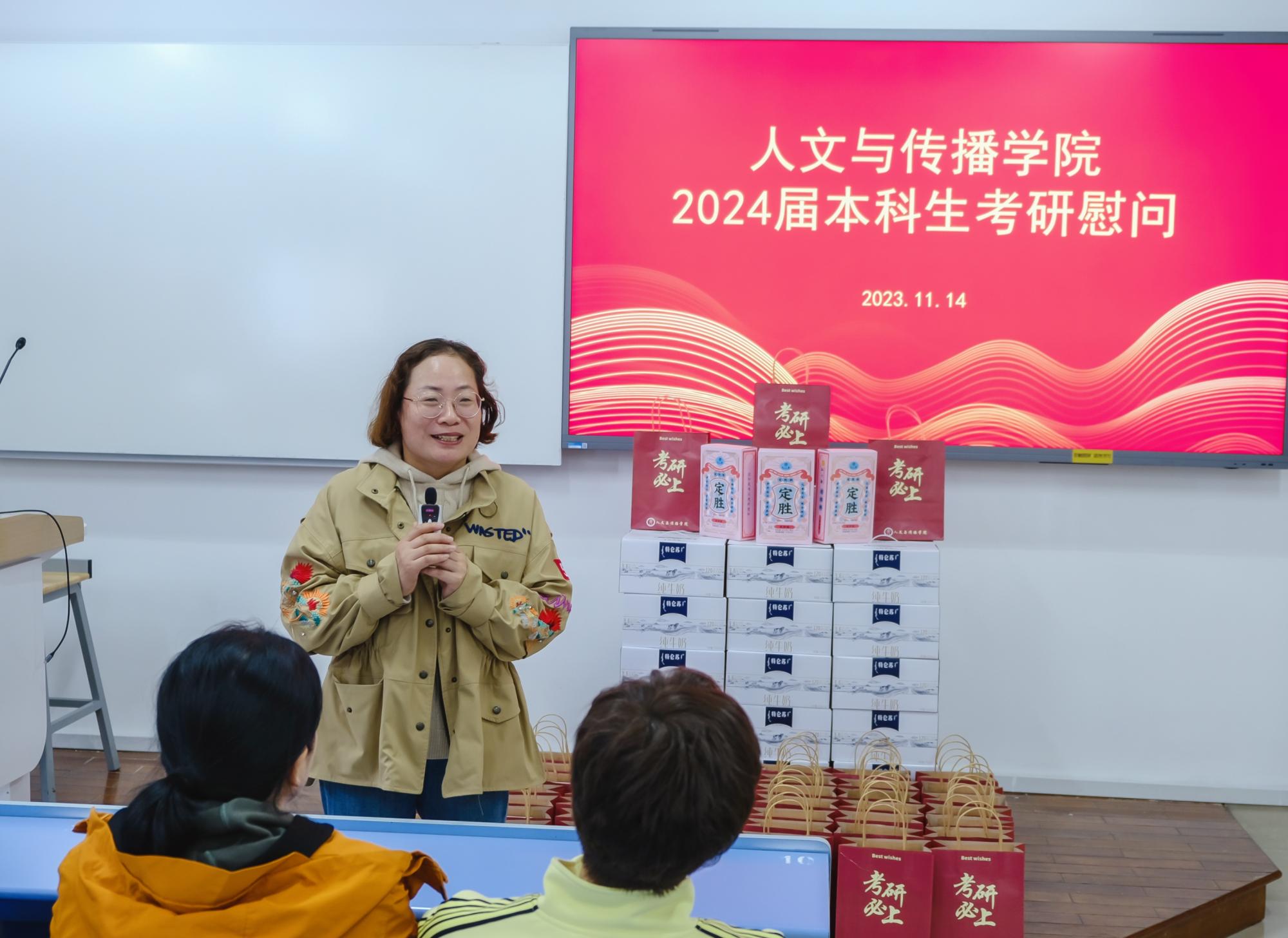 11月14日,suncitygroup太阳成集团于B楼201教室举办了2024届本科生考研慰问活动,院长周保欣、院党委书记高燕、院长助理吴智斌、网络与新媒体系主任王文奇、学院辅导员毛婉婧、李惠惠以及2024届考研学子参加,活动由学院党委副书记袁慧兰主持。