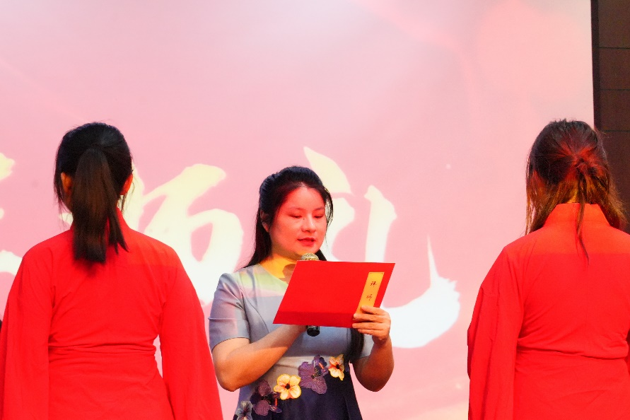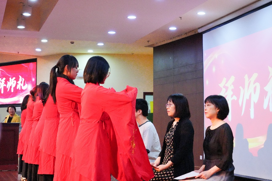 凡学之道,严师为难。师严然后道尊,道尊然后民知敬学。黄咏梅教授、荆亚平教授、付伊副教授、熊啸副教授、王怀榕老师、董建华副教授、王文奇老师、郝文琦老师八位老师作为教师代表上台入席。新生代表向师者行礼并呈上拜师帖,老师们也以小礼相回,新生们恭以大礼相报,而后三拜行拜师礼,老师代表朗诵示训,至此礼成。谆谆教诲中饱含着对各位新生皆能以礼待人、以德修身、时刻自励、勿忘初心的无限期许。