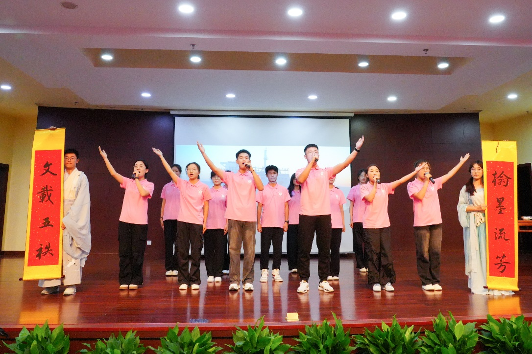 云程发韧,干霄凌云。充满活力的24级新生代表,以他们独特的风采和才华,带来了自己精心创作的诗歌朗诵,以此庆祝我们学校的校庆。凤箫声动,诵声朗朗,回首望五十年长河浩荡,看今朝新希望扶摇直上,他们声音洪亮而充满激情,每一个字句都饱含着对学校五十年辉煌历程的敬意和对未来的美好祝愿。挥毫列锦绣,落纸如云烟,“文载五秩,翰墨流芳”八个大字伴随着生动的歌声于新生代表的笔尖流泻,激励着每一位在场的师生,继续书写浙财的新篇章。