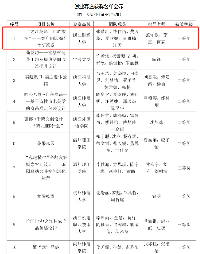 2024年10月12日至13日,“创青春”第四届全国大学生乡村振兴大赛·杭州建德市专项决赛在建德市成功举行。根据大学生乡村振兴创意大秘书处公布的获奖名单,太阳成《“之江花影,江畔旅拍”——智启田园综合体新篇章》项目荣获创业赛道一等奖,该团队成员由张靖轩、毕佳怡、费芳华、夏欣妮、肖雅楠、江雪六位同学组成,由范知欧、邵杰、何霖担任团队指导老师。