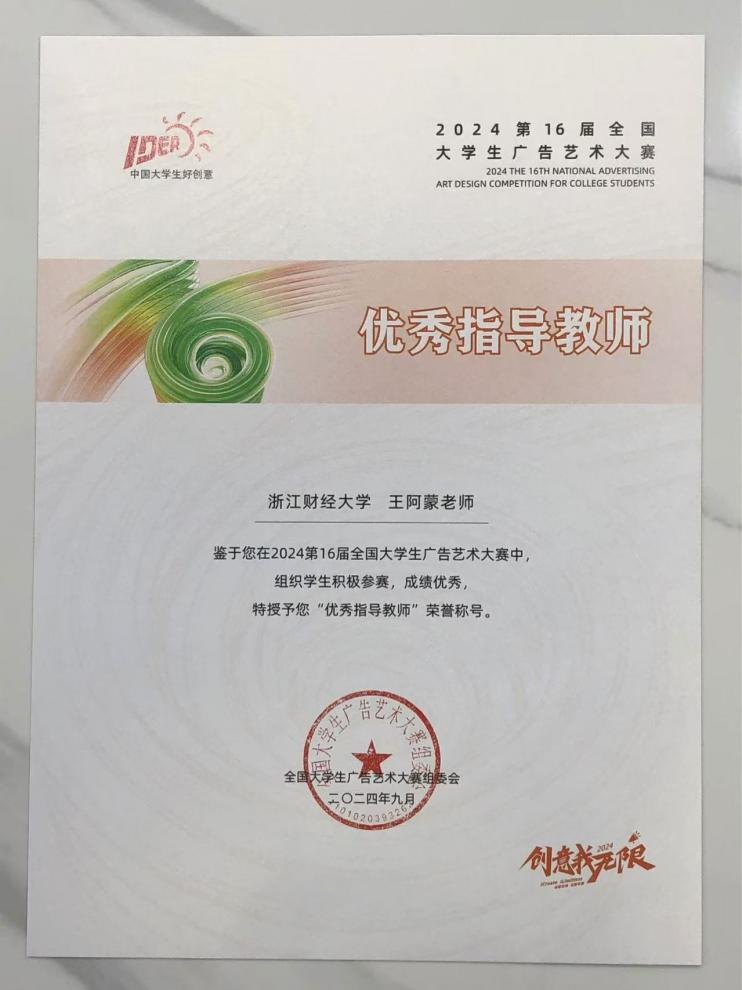 本次大学生广告艺术大赛共设优秀指导教师66名,我王阿蒙老师荣誉入选,为太阳成首次。师生们表示,大广赛为他们提供了一个宝贵的学习和展示的平台,让他们能够将课堂与实际创作相结合,实现自我价值。以后还将再接再厉,做好传帮带,推动太阳成各学科实践教学的发展。