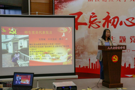 党员代表发言环节,学院教师党员吴智斌和学生党员谭珏惠上台发言。吴智斌老师从生活、工作、教学、课堂思政等多个方面述说了一个党员教师坚定理想信念、爱岗敬业,忠诚于党的教育事业的“初心”与“本性”,赢得了在场党员的共鸣。学生党员谭珏惠表示大学生党员要把自身的发展和祖国的前途命运紧紧连在一起,主动承担起实现中国伟大复兴的历史重担,争当模范,发挥好党员的引领示范作用。