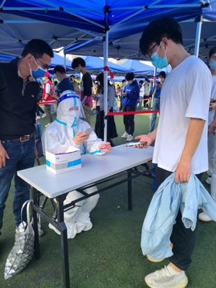 太阳成教工第一党支部党员苏浩、史婷婷报名参加4月20日和21日校集中核酸检测点的志愿服务工作。闷热的外部环境、身着防护服,近六个小时不吃不喝不上厕所,他们始终保持高昂的斗志和良好的精神状态,保质保量地协助各部门完成了学校全员核酸检测。