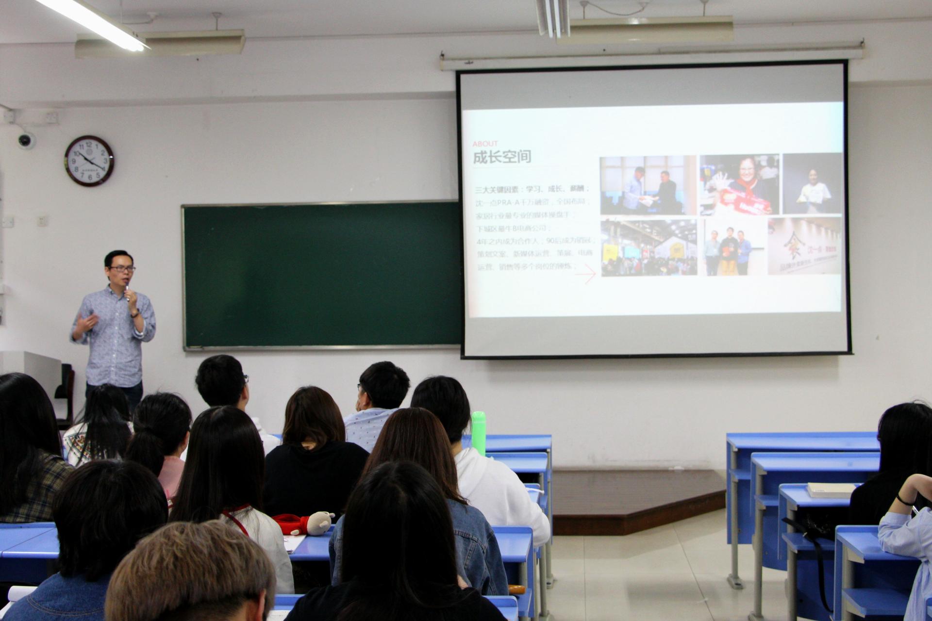 此次讲座由李漪老师主持,特别邀请到“广策传媒”弄房子家居事业部的总经理金光庭以及人事部经理陈松来进行宣讲,太阳成14级同学踊跃参与,现场座无虚席。