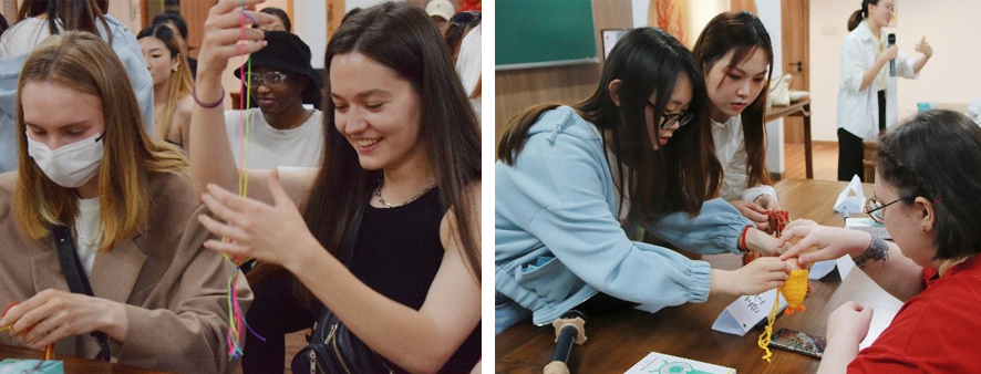 “挂蛋”是立夏常见的习俗之一。这天,人们会将煮熟后完好的鸡蛋装在编好的丝网袋内再挂在胸前,目的是避免“疰夏”,也象征一年无灾无病,健康成长。为了让学生们亲身体验中国传统习俗,学院为参加本次活动的学生准备了鸡蛋、丝线和网袋,在师生的指导下,中外学生们一起动手体验“挂蛋”的乐趣。