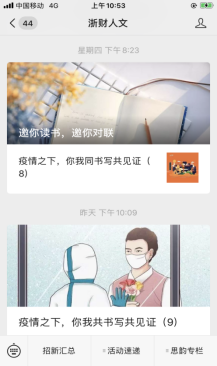 疫情期间,教工党支部的老师们就迅速组织起来,发挥文学专业特长,开展了“以文字为工具”、“以学生为根本”的强持续性“抗疫”行动。教师党员们通过定期向学生转发新冠肺炎的知识、视频与新闻等资讯,提醒学生们时刻防疫抗疫,累计达150多条;为了实现居家不停学,停课不停教,老师们为居家学生搜集了大量名家网课,累积100多个专题,并定期开展在线督促指导,受到学生和家长们的热烈好评;支部还成立了写作指导组,多次召开在线会议,先后对长篇小说《洪流》、剧本《裂》等合计5万字的文学作品进行较为细致、深入的讨论与修改,鼓励同学们坚持文学创作之路,受到学生们的高度认可。支部书记吴智斌老师经常在深夜还在线为学生们解惑答疑,与学生家长合力“定制”学生学习方案。面对汹汹疫情,她带头以匿名的方式向杭州红十字会捐款1000元。研究生导师杨建忠教授主动请缨参与社区疫情防控工作中,协助社区、物业人员疏导车辆,办理出入证,测量体温,用实际行动确保社区居民们的安全。《写作》课教师姚晓平发起了“疫情之下,你我同见证共书写”征文活动,亲自担任编审,有30余篇文章文章由“浙财人文”公众号每日持续推出,点击量3000多人次。
