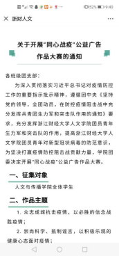 由广告专业学生组成的学生第二党支部面向全院学生开展了“同心战疫”公益广告作品大赛,通过“剧本”、“视频”、“平面设计”等喜闻乐见的形式,引导大学生们提高对新型冠状病毒的防范意识,为坚决打赢疫情防控阻击战贡献力量。