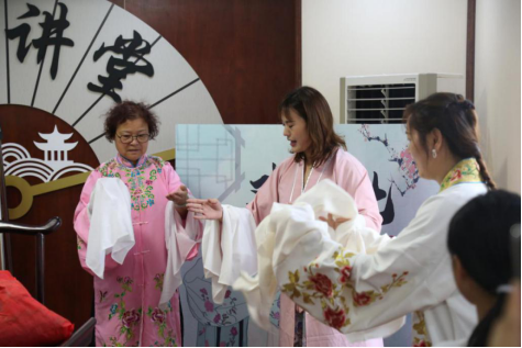 传统戏曲的魅力,现今依旧在舞台上绚丽绽放。毋老师还带来了许多的戏曲道具,戏曲头面、戏衣、鞋靴、折扇等等。在戏曲文化知识讲解之后,许多的居民朋友参与到了手把手的身段教学及实践当中,让大朋友与小朋友们都过足了戏瘾。