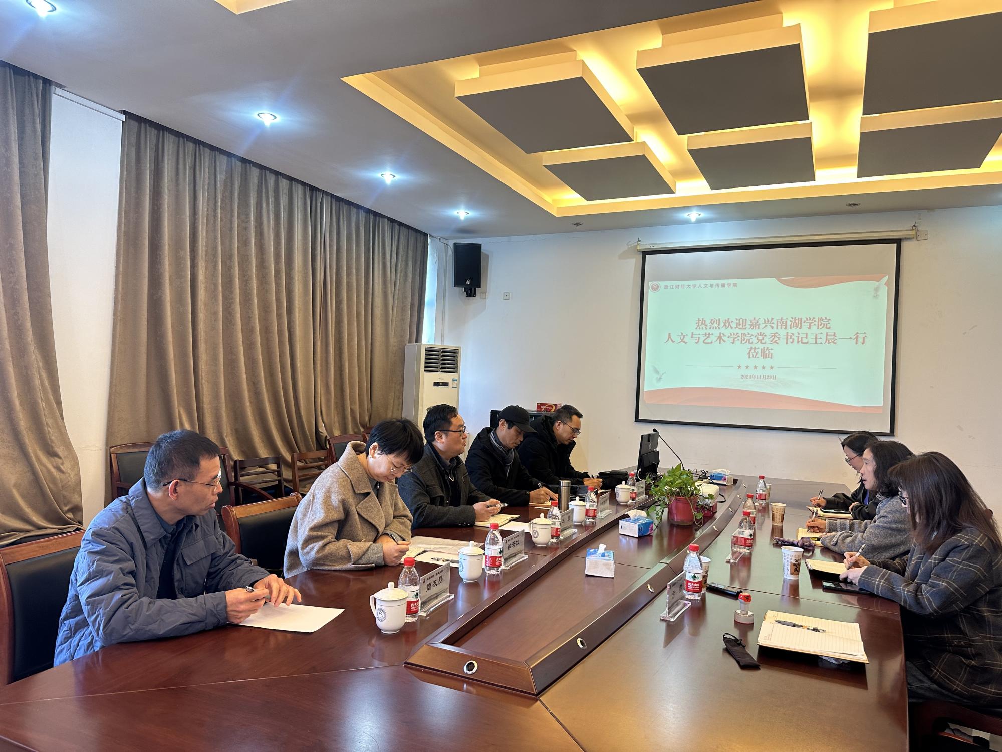 王晨对学院的热情接待表示感谢,并介绍了嘉兴南湖学院人文与艺术学院的基本情况和下一步发展思路,希望双方深化交流合作、携手共谋发展。双方签订了党建共建协议书。学院办公室主任、办公室副主任参加调研交流。